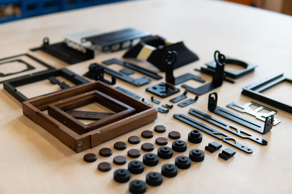 While we employ 3D printing in certain areas, such as the front and back standard, as well as the rotating back and ground glass focusing screen carrier, it is done purposefully. The utilization of 3D printing provides an unparalleled strength-to-weight ratio and allows for swift modifications and future upgrades, such as roll film back add-ons. These 3D printed parts are constructed using Carbon fiber reinforced PLA filament.